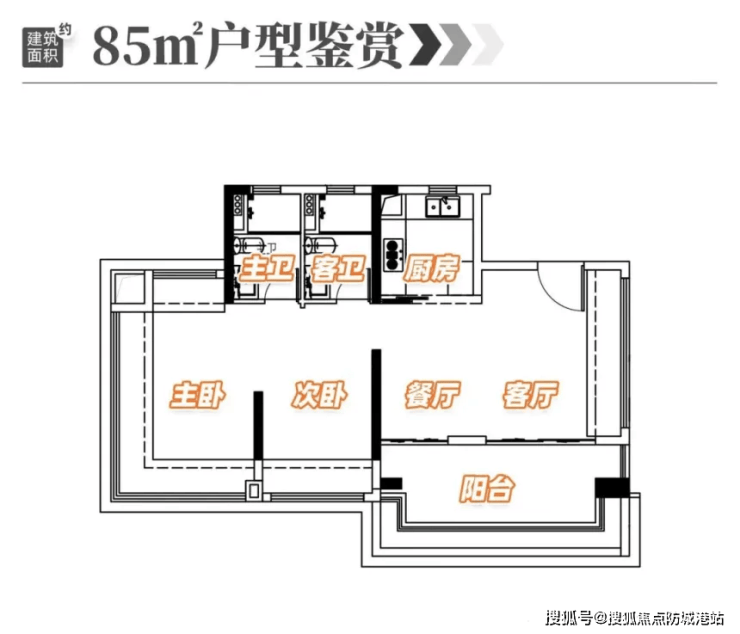 85㎡三房两厅两卫:LDKB一体化设想(客堂+餐厅+厨房+阳台),配备超6米景不雅阳台,总价348万元起,兼顾适用取视野。